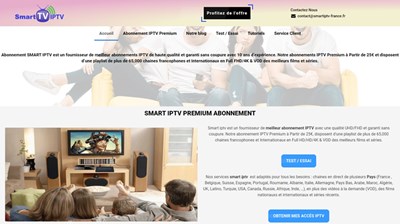 SMART IPTV vous offre un abonnement IPTV a partir de 21 euro , Découvrez les meilleurs Abonnements IPTV jusqu’à 70000 Chaîne internationaux et VODS de films et séries Netflix, IPTV France,IPTV à meilleur prix!, IPTV Maroc.Compatible Avec Smart Tv, Mag et Box Android IPTV, Avec test iptv gratuit... support 7/7. La mission de notre site Web est de fournir un abonnement IPTV à ses clients de manière rapide et stable. Nous offrons différents forfaits IPTV: 3 mois, 6 mois et 12 mois.